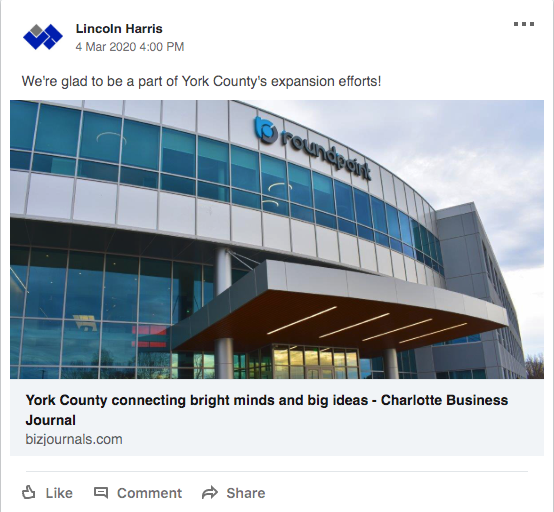 Pics sent to Philip on 2/12. Can we delete everything and just leave it as ‘We’re glad to be a part of York County’s expansion efforts!’ Send me the updated post with the new pic and copy and I will send to RP for approval. They are very particular…