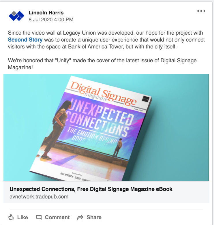 Our hope for the video wall in the lobby of Bank of America Tower was to create a unique user experience that would not only connect visitors with the space, but with the city itself. We’re honored that ‘Unify’ created by our friends at Second Story, made the cover of the latest issue of Digital Signage Magazine!